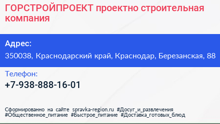 ГОРСТРОЙПРОЕКТ, проектно-строительная компания по адресу 350038, Краснодарский край, Краснодар, Березанская, 88 в дальнейшем Организация, размещена в следующих категориях: