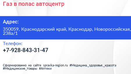 Газ в полас, автоцентр по адресу 350059, Краснодарский край, Краснодар, Новороссийская, 238а/1 в дальнейшем Организация, размещена в следующих категориях: