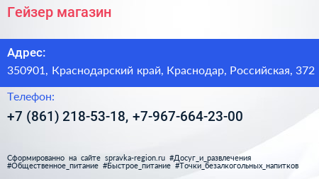 Гейзер, магазин по адресу 350901, Краснодарский край, Краснодар, Российская, 372 в дальнейшем Организация, размещена в следующих категориях: