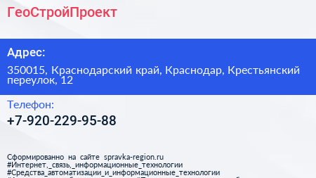 ГеоСтройПроект по адресу 350015, Краснодарский край, Краснодар, Крестьянский переулок, 12 в дальнейшем Организация, размещена в следующих категориях: