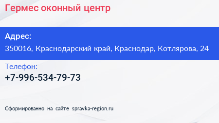 Гермес, оконный центр по адресу 350016, Краснодарский край, Краснодар, Котлярова, 24 в дальнейшем Организация, размещена в следующих категориях: