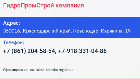 ГидроПромСтрой, компания по адресу 350016, Краснодарский край, Краснодар, Карякина, 19 в дальнейшем Организация, размещена в следующих категориях: