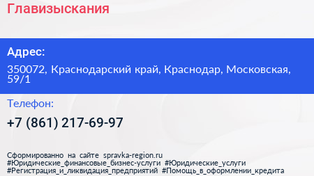 Главизыскания по адресу 350072, Краснодарский край, Краснодар, Московская, 59/1 в дальнейшем Организация, размещена в следующих категориях: