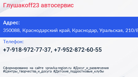 Глушакoff23, автосервис по адресу 350088, Краснодарский край, Краснодар, Уральская, 210/8 в дальнейшем Организация, размещена в следующих категориях: