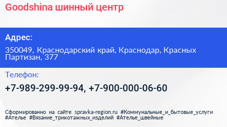 Goodshina, шинный центр по адресу 350049, Краснодарский край, Краснодар, Красных Партизан, 377 в дальнейшем Организация, размещена в следующих категориях: