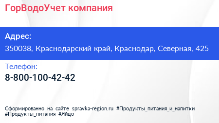ГорВодоУчет, компания по адресу 350038, Краснодарский край, Краснодар, Северная, 425 в дальнейшем Организация, размещена в следующих категориях: