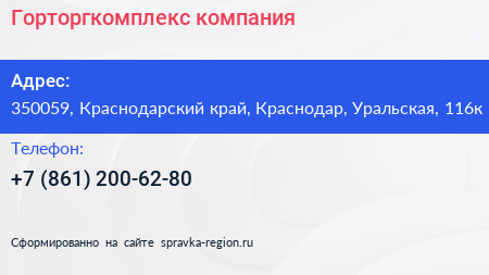 Горторгкомплекс, компания по адресу 350059, Краснодарский край, Краснодар, Уральская, 116к в дальнейшем Организация, размещена в следующих категориях:
