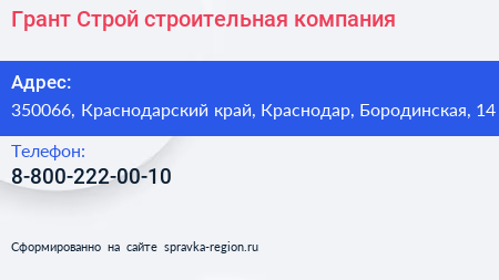 Грант Строй, строительная компания по адресу 350066, Краснодарский край, Краснодар, Бородинская, 14 в дальнейшем Организация, размещена в следующих категориях:
