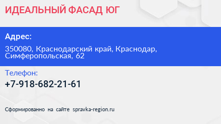 ИДЕАЛЬНЫЙ ФАСАД-ЮГ по адресу 350080, Краснодарский край, Краснодар, Симферопольская, 62 в дальнейшем Организация, размещена в следующих категориях: