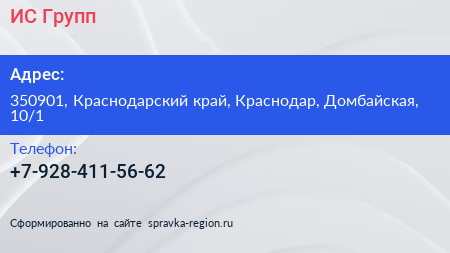 ИС-Групп по адресу 350901, Краснодарский край, Краснодар, Домбайская, 10/1 в дальнейшем Организация, размещена в следующих категориях: