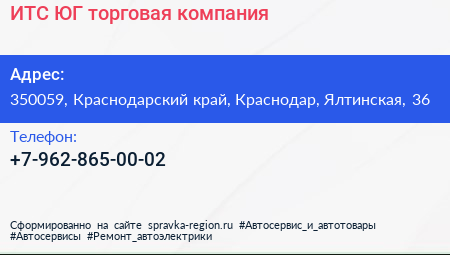 ИТС ЮГ, торговая компания по адресу 350059, Краснодарский край, Краснодар, Ялтинская, 36 в дальнейшем Организация, размещена в следующих категориях:
