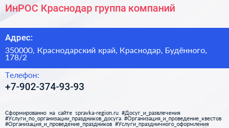 ИнРОС Краснодар, группа компаний по адресу 350000, Краснодарский край, Краснодар, Будённого, 178/2 в дальнейшем Организация, размещена в следующих категориях: