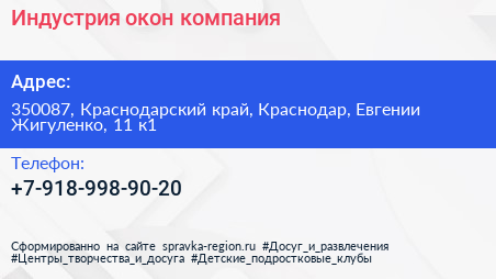 Индустрия окон, компания по адресу 350087, Краснодарский край, Краснодар, Евгении Жигуленко, 11 к1 в дальнейшем Организация, размещена в следующих категориях: