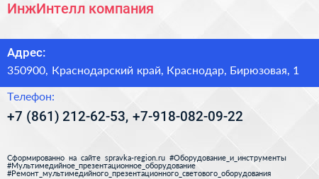 ИнжИнтелл, компания по адресу 350900, Краснодарский край, Краснодар, Бирюзовая, 1 в дальнейшем Организация, размещена в следующих категориях: