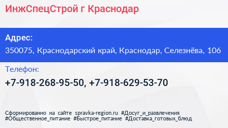 ИнжСпецСтрой, г. Краснодар по адресу 350075, Краснодарский край, Краснодар, Селезнёва, 106 в дальнейшем Организация, размещена в следующих категориях: