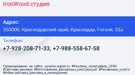 IronWood, студия по адресу 350000, Краснодарский край, Краснодар, Гоголя, 51а в дальнейшем Организация, размещена в следующих категориях: