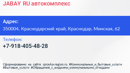 JABAY.RU, автокомплекс по адресу 350004, Краснодарский край, Краснодар, Минская, 62 в дальнейшем Организация, размещена в следующих категориях: