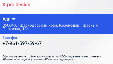 K-pro.design по адресу 350049, Краснодарский край, Краснодар, Красных Партизан, 134 в дальнейшем Организация, размещена в следующих категориях: