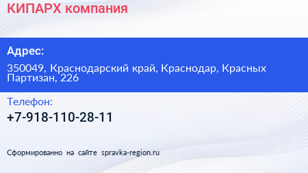 КИПАРХ, компания по адресу 350049, Краснодарский край, Краснодар, Красных Партизан, 226 в дальнейшем Организация, размещена в следующих категориях: