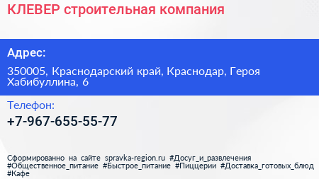 КЛЕВЕР, строительная компания по адресу 350005, Краснодарский край, Краснодар, Героя Хабибуллина, 6 в дальнейшем Организация, размещена в следующих категориях: