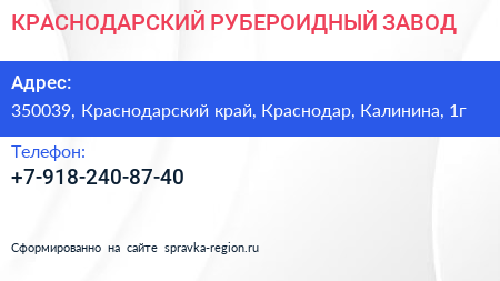 КРАСНОДАРСКИЙ РУБЕРОИДНЫЙ ЗАВОД по адресу 350039, Краснодарский край, Краснодар, Калинина, 1г в дальнейшем Организация, размещена в следующих категориях: