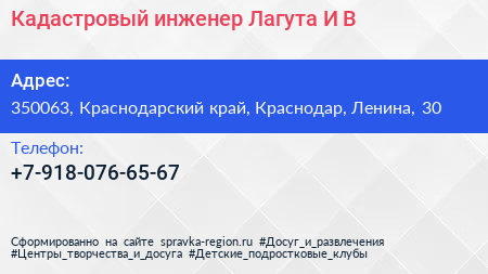 Кадастровый инженер Лагута И.В. по адресу 350063, Краснодарский край, Краснодар, Ленина, 30 в дальнейшем Организация, размещена в следующих категориях: