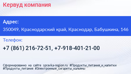 Для связи с организацией воспользуйтесь номером телефона: +7 (861) 216-72-51, +7-918-401-21-00. Пн: c 09:00-18:00, Вт: c 09:00-18:00, Ср: c 09:00-18:00, Чт: c 09:00-18:00, Пт: c 09:00-18:00, Сб: выходной, Вс: выходной, вы можете обратиться в эту организацию.