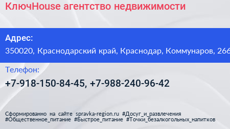 КлючHouse, агентство недвижимости по адресу 350020, Краснодарский край, Краснодар, Коммунаров, 266 в дальнейшем Организация, размещена в следующих категориях: