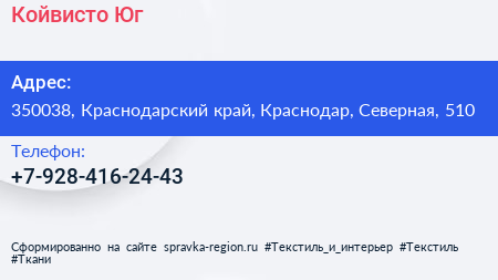 Койвисто-Юг по адресу 350038, Краснодарский край, Краснодар, Северная, 510 в дальнейшем Организация, размещена в следующих категориях: