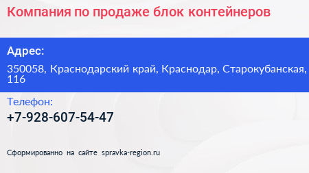 Компания по продаже блок-контейнеров по адресу 350058, Краснодарский край, Краснодар, Старокубанская, 116 в дальнейшем Организация, размещена в следующих категориях: