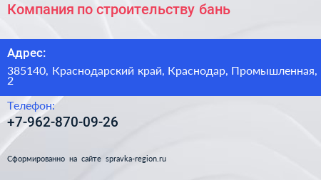 Компания по строительству бань по адресу 385140, Краснодарский край, Краснодар, Промышленная, 2 в дальнейшем Организация, размещена в следующих категориях: