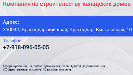Компания по строительству канадских домов по адресу 350042, Краснодарский край, Краснодар, Выставочная, 10 в дальнейшем Организация, размещена в следующих категориях:
