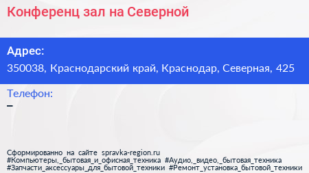 Конференц-зал на Северной по адресу 350038, Краснодарский край, Краснодар, Северная, 425 в дальнейшем Организация, размещена в следующих категориях:
