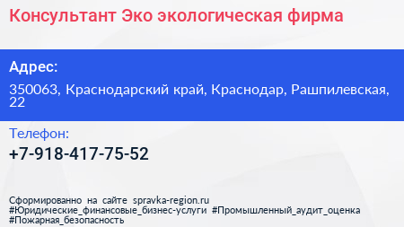 Консультант Эко, экологическая фирма по адресу 350063, Краснодарский край, Краснодар, Рашпилевская, 22 в дальнейшем Организация, размещена в следующих категориях: