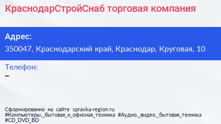 КраснодарСтройСнаб, торговая компания по адресу 350047, Краснодарский край, Краснодар, Круговая, 10 в дальнейшем Организация, размещена в следующих категориях: