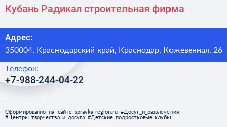 Кубань-Радикал, строительная фирма по адресу 350004, Краснодарский край, Краснодар, Кожевенная, 26 в дальнейшем Организация, размещена в следующих категориях:
