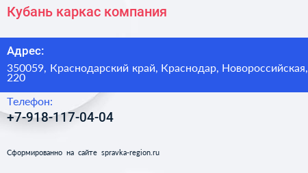 Кубань каркас, компания по адресу 350059, Краснодарский край, Краснодар, Новороссийская, 220 в дальнейшем Организация, размещена в следующих категориях: