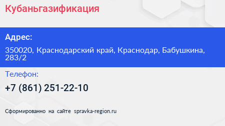 Кубаньгазификация по адресу 350020, Краснодарский край, Краснодар, Бабушкина, 283/2 в дальнейшем Организация, размещена в следующих категориях: