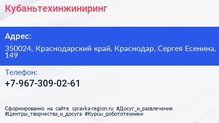 Кубаньтехинжиниринг по адресу 350024, Краснодарский край, Краснодар, Сергея Есенина, 149 в дальнейшем Организация, размещена в следующих категориях: