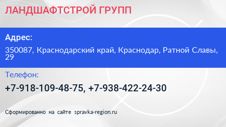ЛАНДШАФТСТРОЙ ГРУПП по адресу 350087, Краснодарский край, Краснодар, Ратной Славы, 29 в дальнейшем Организация, размещена в следующих категориях: