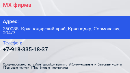 МХ, фирма по адресу 350088, Краснодарский край, Краснодар, Сормовская, 204/7 в дальнейшем Организация, размещена в следующих категориях:
