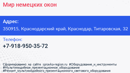 Мир немецких окон по адресу 350915, Краснодарский край, Краснодар, Титаровская, 32 в дальнейшем Организация, размещена в следующих категориях: