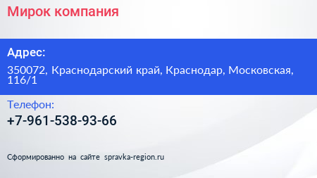 Мирок, компания по адресу 350072, Краснодарский край, Краснодар, Московская, 116/1 в дальнейшем Организация, размещена в следующих категориях: