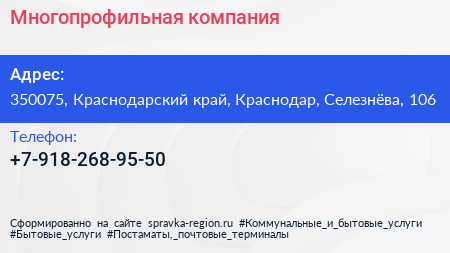 Многопрофильная компания по адресу 350075, Краснодарский край, Краснодар, Селезнёва, 106 в дальнейшем Организация, размещена в следующих категориях: