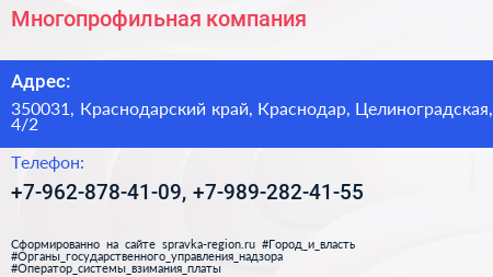 Многопрофильная компания по адресу 350031, Краснодарский край, Краснодар, Целиноградская, 4/2 в дальнейшем Организация, размещена в следующих категориях: