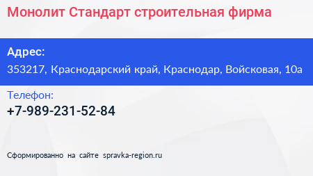 Монолит Стандарт, строительная фирма по адресу 353217, Краснодарский край, Краснодар, Войсковая, 10а в дальнейшем Организация, размещена в следующих категориях: