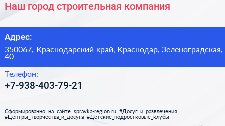 Наш город, строительная компания по адресу 350067, Краснодарский край, Краснодар, Зеленоградская, 40 в дальнейшем Организация, размещена в следующих категориях: