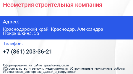 Неометрия, строительная компания по адресу Краснодарский край, Краснодар, Александра Покрышкина, 5а в дальнейшем Организация, размещена в следующих категориях: