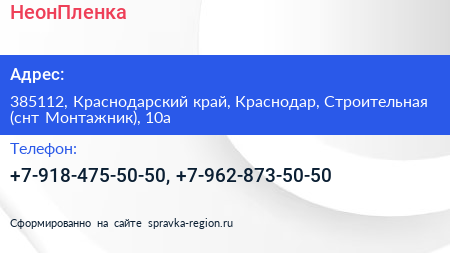 НеонПленка по адресу 385112, Краснодарский край, Краснодар, Строительная (снт Монтажник), 10а в дальнейшем Организация, размещена в следующих категориях: