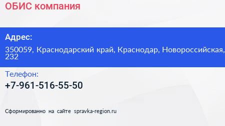 ОБИС, компания по адресу 350059, Краснодарский край, Краснодар, Новороссийская, 232 в дальнейшем Организация, размещена в следующих категориях: